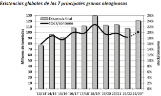 La evolución de los precios se ha visto influida por el comportamiento observado en los balances de la oferta y demanda global. En los últimos años la dinámica exhibida por la producción y el consumo en el mundo ha resultado en una sostenida recuperación de las existencias de los principales granos oleaginosos. En las últimas previsiones de Oil World para el ciclo 2022/23 (divulgadas en el pasado mes de noviembre) se proyecta un incremento de 13% para las existencias globales del conjunto de los 7 principales granos oleaginosos y el indicador existencias/consumo asciende a 20%. Ambas referencias se mantienen en niveles altos en relación a lo registrado en los últimos 10 años.