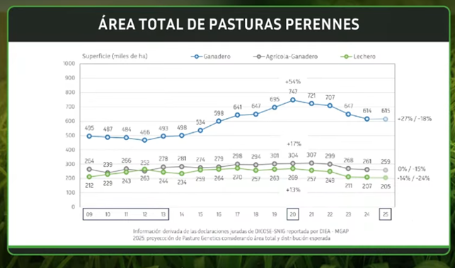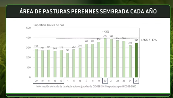 Al analizar el área de pasturas perennes que siembran cada año, también se ha dado un aumento importante. En 2009 se implantaban unas 287 mil ha, mientras que en 2025 esa superficie treparía a unas 348 mil ha (+26%).