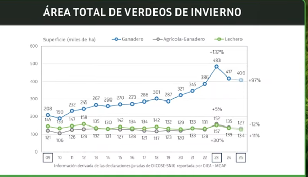 Allí Díaz destacó el fuerte crecimiento que tuvo el área de pasturas perenes y verdeos, que pasó de un área de cerca de 1,5 millones de ha en 2009 a más de 1,750 millones de ha en 2025 (+21%). El máximo se registró en 2023 con poco más de 1,9 millones de ha.