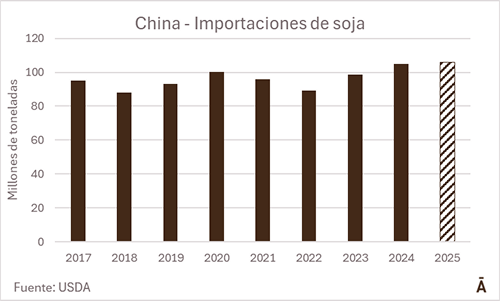 La producción de soja en China para el año comercial 2024/25 se estima en 19,8 millones de toneladas, con una leve reducción respecto al ejercicio anterior. Se prevé una desaceleración en el crecimiento de la demanda de soja, ya que los consumidores chinos están optando por fuentes de proteínas más eficientes en términos de alimentación, como las aves y los productos acuáticos, en lugar de la carne de cerdo. Estas consideraciones las realizó la semana pasada la oficina del USDA en Beijing.