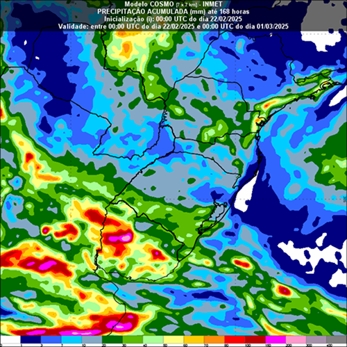 De acuerdo a los datos de imágenes satelitales que divulgó el meteorólogo Miguel Bidegain la luvia acumulada prevista hasta el próximo viernes 28 llegará hasta los 150 mm, según COSMO. Este modelo proyecta montos de 30 mm a más de 150 mm sobre el sudeste y norte de la provincia de Buenos Aires y litoral oeste de Uruguay. Toda la región recibirá lluvias que estarían en una franja de 20 a 60 mm entre los días martes y viernes.