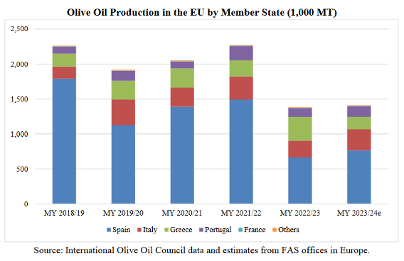En la campaña 2023/24, la Unión Europea (UE) se enfrenta a una segunda reducida cosecha consecutiva de producción de aceite de oliva, de acuerdo con lo proyectado por la oficina del USDA en Madrid.