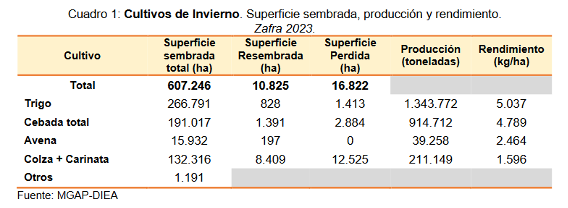 La superficie total sembrada con cultivos de invierno fue estimada en 607.246 hectáreas por la Dirección de Estadísticas Agropecuarias (DIEA) del Ministerio de Ganadería (MGAP), 29,5 % menos que en la zafra del invierno anterior. Para el trigo se estimó una producción de 1.343.772 toneladas, un 5 % superior a la zafra anterior, y el máximo histórico del cultivo en el país.