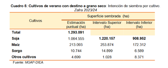 DIEA estimó una superficie de cultivos de verano para grano seco en la campaña 2023/24 de 1.293.091 hectáreas, 4,5% más que en el ejercicio anterior.