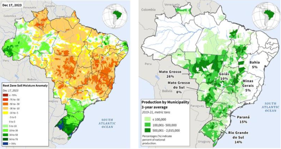 La oficina del Departamento de Agricultura de Estados Unidos (USDA) en Brasilia revisó a la baja la producción de soja de la campaña 2023/24 a 158,5 millones de toneladas debido a las malas perspectivas climáticas resultantes de El Niño, particularmente en los estados del Centro Oeste, que pueden afectar los rendimientos finales actualmente proyectados en 3,507 kg/ha.