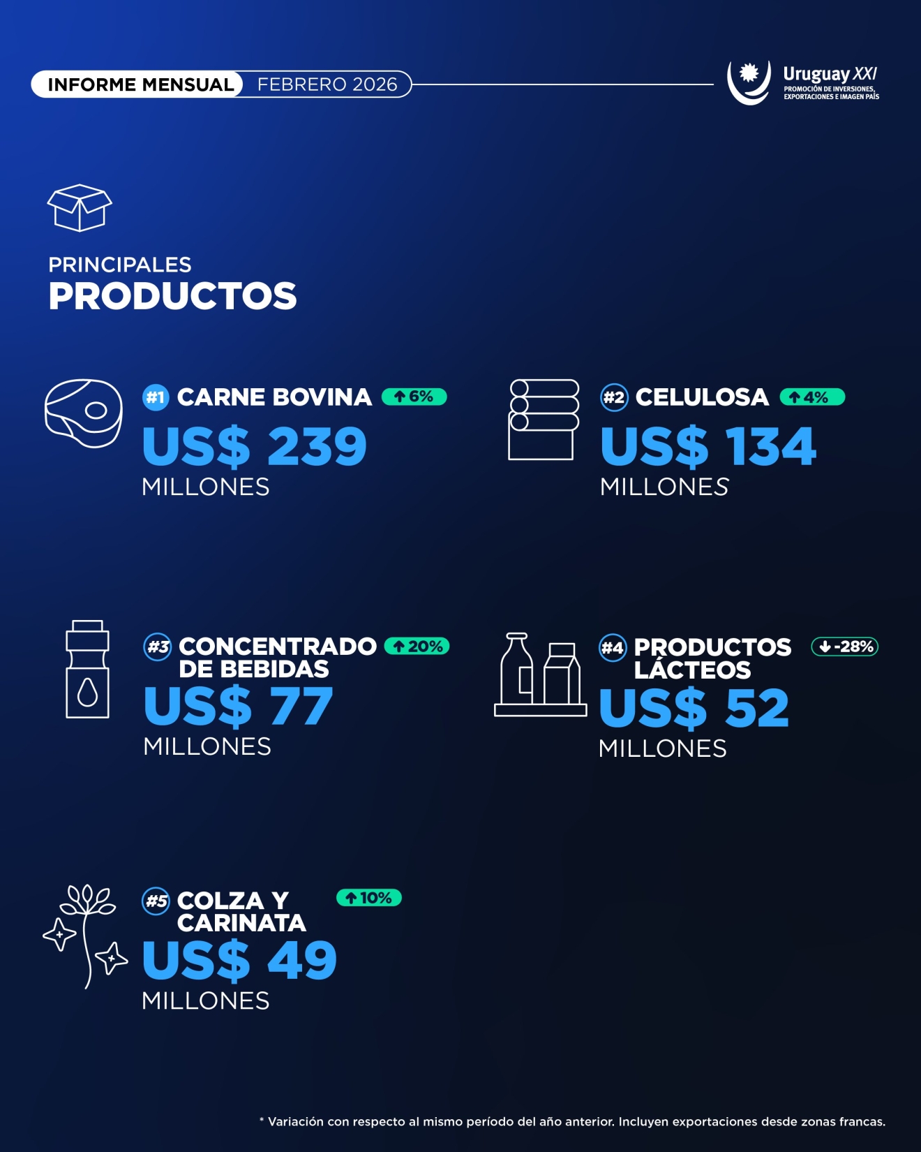 La carne bovina fue el principal producto del mes, con ventas por US$ 239 millones (+6% interanual). En segundo lugar se ubicó la celulosa con US$ 134 millones (+4%) y el concentrado de bebidas ocupó el tercer lugar con US$ 77 millones (+20%).