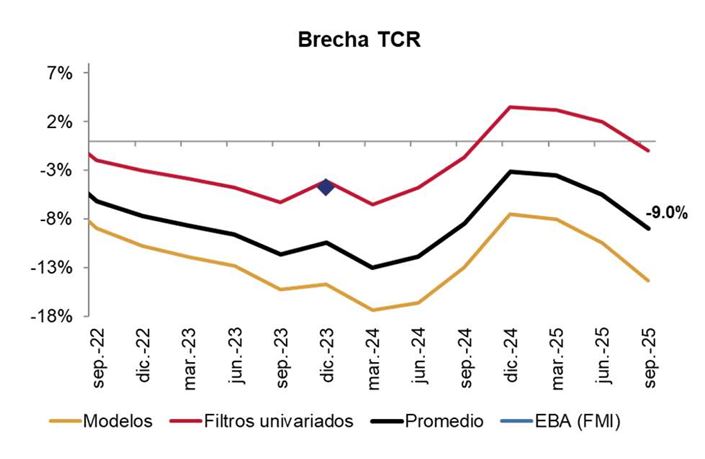 De todas formas, la brecha que existe entre el TCR efectivo y el TCR de fundamentos en el trimestre a setiembre fue de -9%, por encima del desvío que se había registro en el trimestre cerrado a junio y marzo, respectivamente.