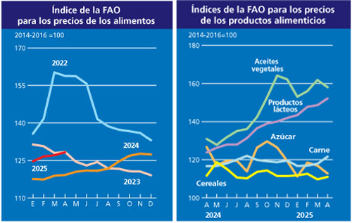En tanto, el índice de precios de la carne de la FAO registró en abril un promedio de 121,6 puntos, esto es, 3,7 puntos (3,2%) más que en marzo y un aumento anual de 5,0 puntos (4,3 %). Las cotizaciones internacionales de la carne subieron en todas las categorías, siendo los precios de la carne de cerdo los que registraron el aumento más significativo.