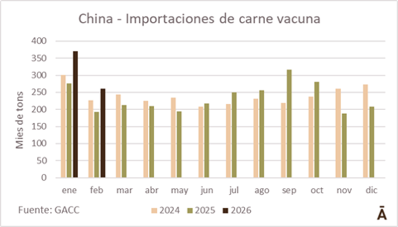 En los dos primeros meses de 2026 China importó alrededor de 630 mil toneladas de carne vacuna por US$ 3.529 millones, de acuerdo con información de las Aduanas chinas dadas a conocer este miércoles.