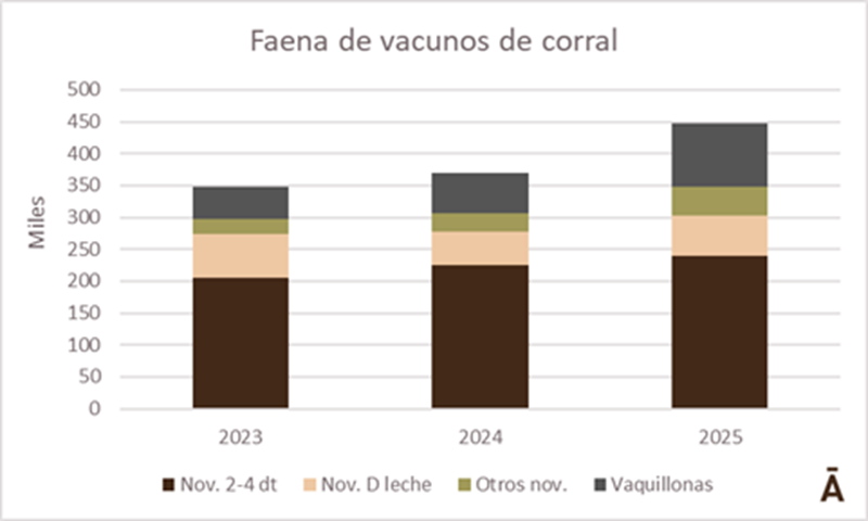 Esas casi 450 mil cabezas provenientes de corrales certificados son 30% del total de novillos y vaquillonas enviados a faena en 2025 y 18% de la faena total, incluyendo las demás categorías (vacas y toros).