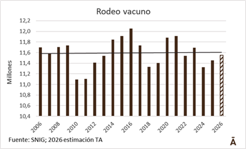 El rodeo vacuno uruguayos se ha mantenido con escasas variaciones en las dos últimas décadas con un promedio que oscila en los 11,6 millones de cabezas. Al finalizar el ejercicio 2025/26 registrará un moderado aumento, seguramente de unas 100 mil cabezas, a 11,55 millones, muy cerca del promedio de las dos últimas décadas.