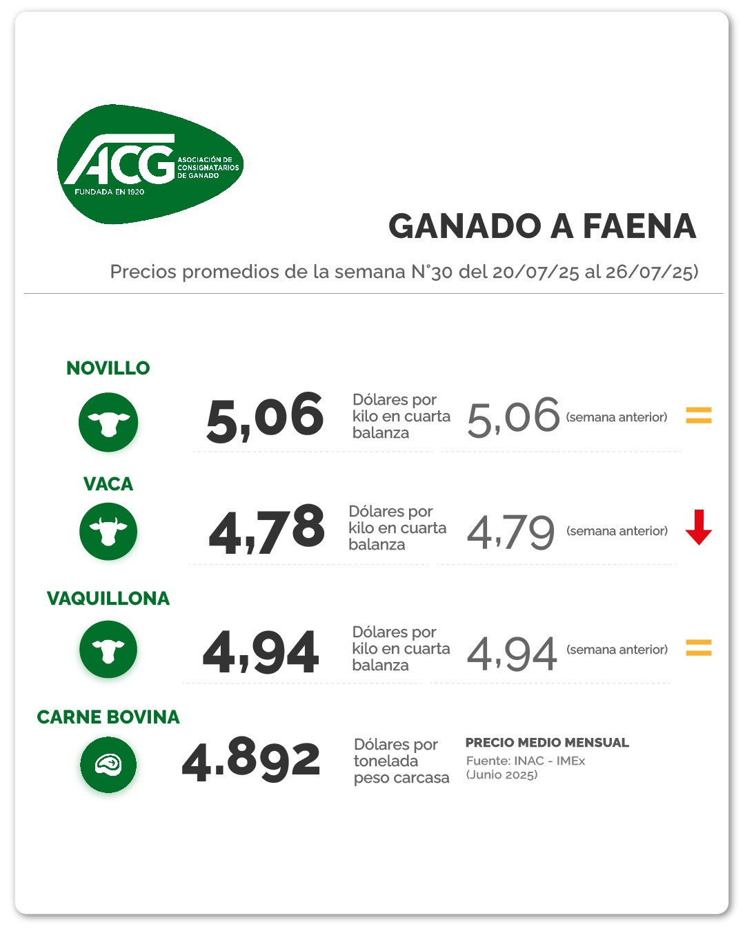 Los precios de la hacienda con destino a faena parecen haber encontrado un punto de equilibrio. “Con importante recuperación en la actividad de faena; mercado estable”, dijo la ACG tras su reunión de precios de este lunes 28 de julio.
