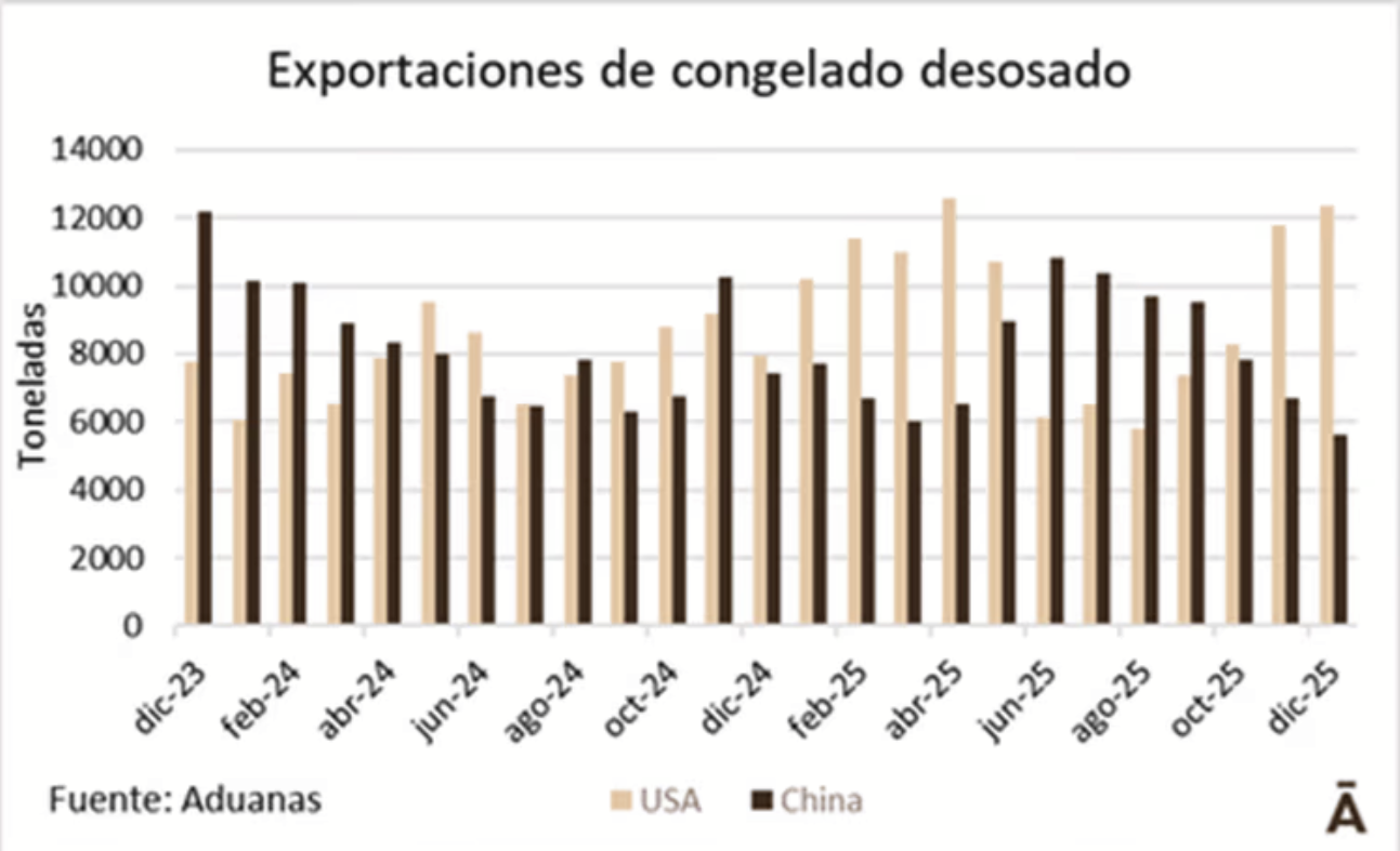 En el acumulado anual predominó China como principal destino en volumen on 152 mil toneladas, con una moderada caída anual de 1%, pero 30 mil tons más que las 122 mil embarcadas a EEUU.