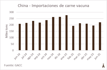 Las importaciones de carne vacuna por parte de China aumentaron a unas 220 mil toneladas en junio, el mayor volumen desde enero y por encima del mismo mes del año anterior, de acuerdo con datos del GACC dados a conocer por OIG+X. Es el primer mes del año en que el volumen aumenta en la comparación anual. El monto de estas importaciones fue de US$ 1.106 millones, a lo que se agregan US$ 12 millones por menudencias vacunas.