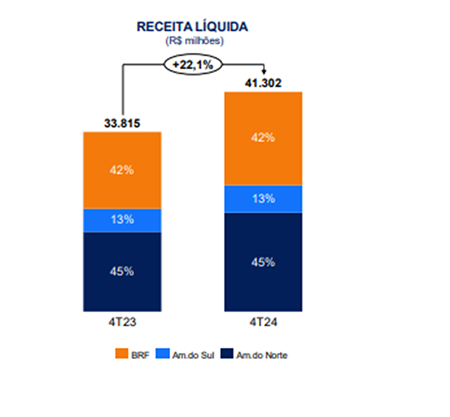 Marfrig vio su beneficio neto aumentar un 21.714,7%, de R$ 12 millones en el cuarto trimestre de 2023 a R$ 2,58 mil millones en igual período de 2024. La variación se explica por la plusvalía en la operación de venta de activos sudamericanos a Minerva Foods y por el mejor desempeño de las operaciones en América del Sur y de BRF. En la misma comparación, el EBITDA creció un 37,1%, alcanzando R$ 3.747 millones. Los ingresos netos aumentaron un 22,1%, totalizando R$ 41.302 millones.