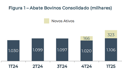 Minerva también informó que el volumen de ventas aumentó 19,8%, pasando de 346,1 mil toneladas a 414,6 mil toneladas. En el primer trimestre de 2025, el volumen consolidado de sacrificio de ganado bovino totalizó 414,6 mil cabezas, un incremento de 19,8% respecto al mismo período de 2024. Además, Minerva reportó un incremento de 38,7% en el sacrificio en la comparación anual, hasta 1,429 millones de cabezas.