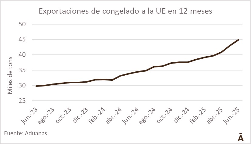 Las exportaciones de carne vacuna congelada a los países miembros de la Unión Europea siguen creciendo a paso acelerado, apuntaladas por la caída de la producción doméstica. En junio, de acuerdo con datos de Aduanas, se embarcaron 2.550 toneladas, la mayor cantidad mensual en más de 13 años, desde mayo de 2012.