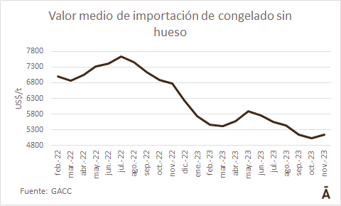 En noviembre China importó 236.666 toneladas peso embarque de carne vacuna a un valor medio de US$/t 4.966, de acuerdo con datos dados a conocer por el GACC. El volumen es 13 mil tons superior al de octubre, en tanto que el valor medio se recuperó unos US$/t 200 (4,2%), dejando por el momento atrás el piso de octubre.