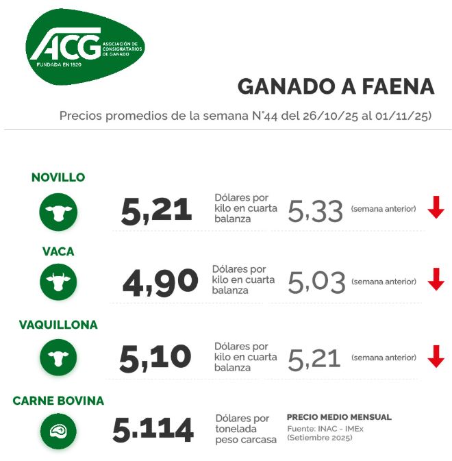 Sobre la reposición, la ACG marcó en su comentario que se "mantiene la tendencia típica de la época en oferta y valores", que en su mayoría corrigieron a la baja para las distintas categorías. El ternero perdió 8 cents en la última semana a US$ 3,34 por kg en pie, la ternera 5 cents a US$ 3,14, mientras que la baja de invernada bajó 2 cents a US$ 2,21 por kg.