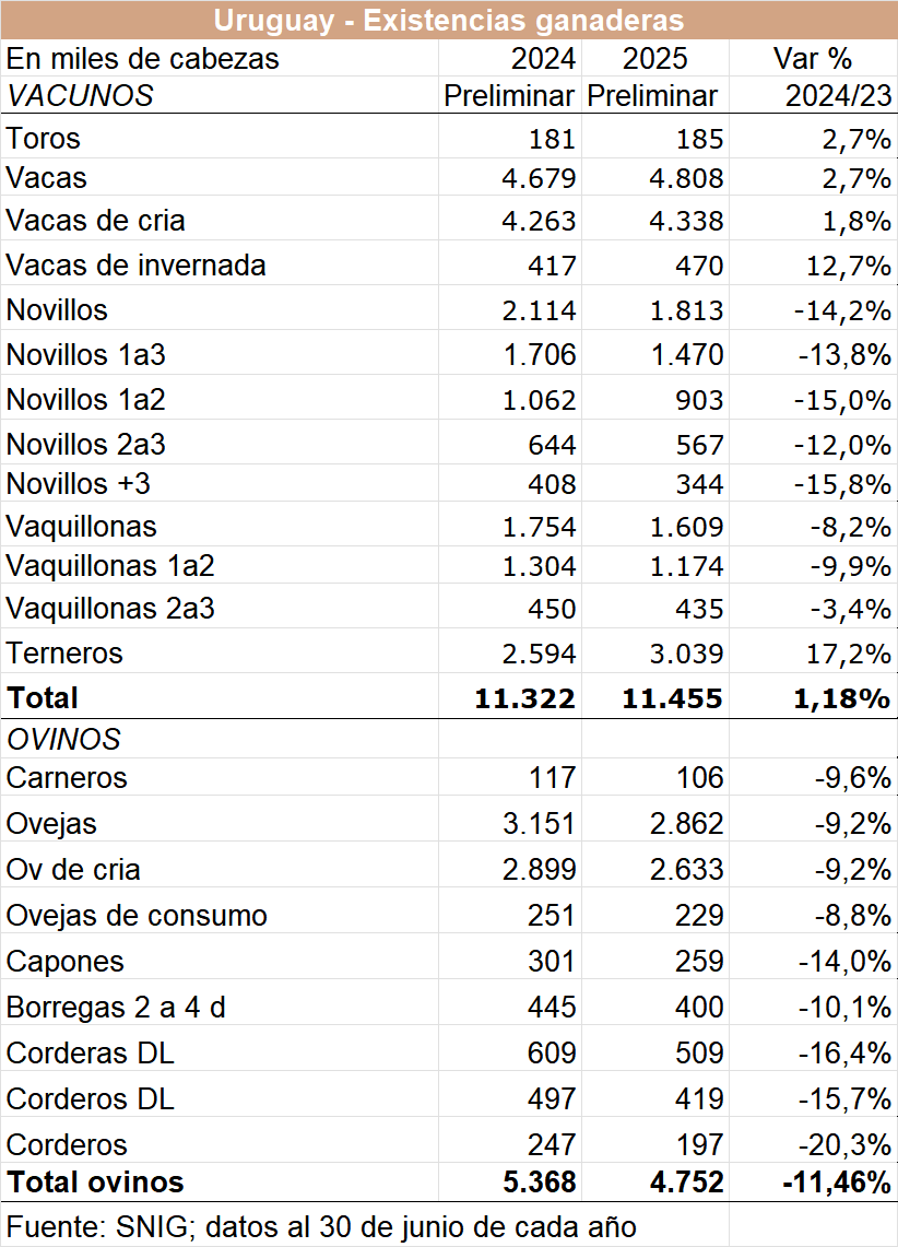 Los datos oficiales de existencias vacunas dan cuenta de 11,455 millones de vacunos, con un moderado crecimiento respecto al mismo día de 2024 de 1,2% (133 mil cabezas). Los terneros contabilizados sumaron 3,039 millones, superando el anterior máximo histórico de 2020, cuando ascendieron a 3,015 millones, aunque algo por debajo de las expectativas que eran de que se superaran los 3,1 millones.