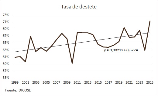 La cantidad de vacas en el rodeo de cría el año pasado, 4,26 millones de cabezas, fue la que produjo los 3,039 millones de terneros. La tasa de destete fue de 71,3%, la mayor proporción de la historia. Aunque al eslabón de la cría es al que más le cuesta mejorar sus índices, a su paso lo va haciendo.