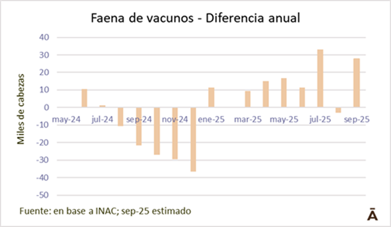 En el acumulado del año al 27 de setiembre se faenaron 1,78 millones de vacunos, 6,8% más que los 1,67 millones a la misma fecha del año pasado.