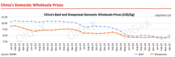 Los precios mayoristas de la carne vacuna mostraron señales de reacción en abril. De acuerdo con información de la publicación mensual de OIG+X, el valor medio superó los US$ 8,50 el kilo, tras haberse ubicado en el entorno de US$ 8 en febrero y marzo. A su vez, somo se observa en el gráfico, el precio mayorista de la carne vacuna superó al de la ovina luego de un primer trimestre de 2025 durante el que cotizó por debajo.