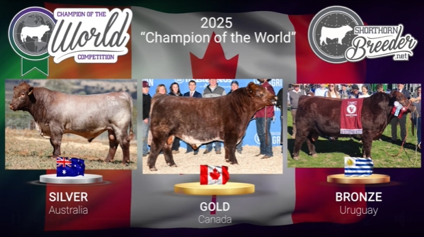 En el caso de la raza Shorthorn el Gran Campeón de la Expo Prado 2025, que también fue seleccionado como el mejor ejemplar sudamericano, en la definición final alcanzó la medalla de bronce (5 puntos), detrás de sus pares de Canadá (11 puntos) y Australia (6 puntos). Recordemos que este ejemplar pertenece a la cabaña “La Loma”, de Juan Francisco Nacimento (RP 158).
