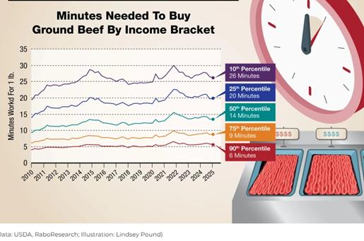 Pese al aumento sostenido de los precios minoristas de la carne vacuna, los consumidores estadounidenses continúan dispuestos a dedicar más minutos de trabajo para adquirir una libra de carne picada, según un análisis de RaboResearch.