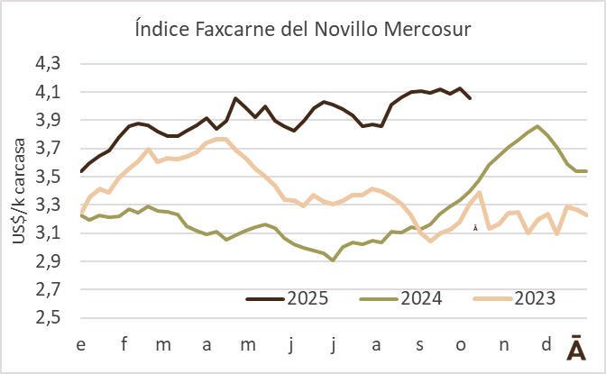El índice World Beef Report del Novillo Mercosur perdió 7 centavos en la última semana y retornó a los niveles de mediados de agosto con una cotización de US$ 4,06 por kg a la carne.