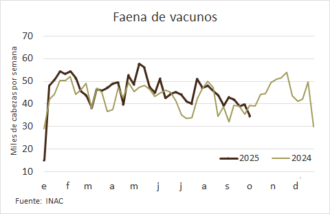 La faena vacuna se contrajo 13% en la última semana y tocó un mínimo en el año desde la primera semana de enero. De acuerdo a los datos que informó el INAC, en la semana al 4 de octubre se procesaron 34.549 vacunos. Cabe precisar que el pasado 2 de octubre hubo un paro de 24 horas de la Federación Obrera de la Industria de la Carne y Afines (Foica).