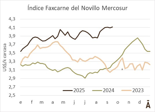 El valor medio del ganado a faena en la región retomó la senda al alza esta semana, tras la pausa de la anterior. El Índice Faxcarne del Novillo Mercosur subió 3 cents a US$ 4,12 el kilo carcasa, máximo desde junio de 2022.