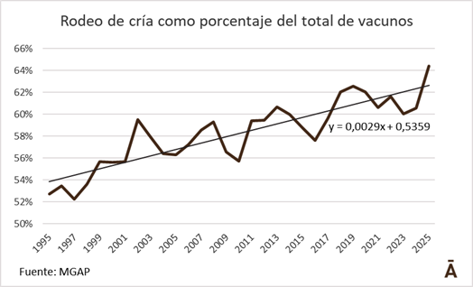 Veinte años atrás, los terneros eran 22% del rodeo y los novillos de más de 3 años el 5%. En junio de 2025 los terneros son 27% del rodeo y los novillos de más de 3 cayeron a 3% del total de vacunos.