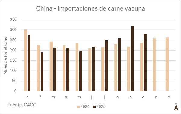 Durante octubre China importó unas 490 mil toneladas de carnes y menudencias por US$ 2.074 millones, de acuerdo con información del GACC dada a conocer por OIG+X. De ese total, 280 mil toneladas eran carne y menudencias vacunas por US$ 1.558 millones, 17,9% por encima del mismo mes del año pasado.