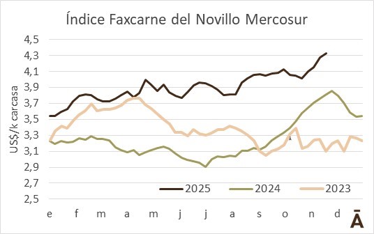 El valor medio del ganado a faena en la región subió por cuarta semana consecutiva, en esta oportunidad apuntalada por un salto en las referencias argentinas. El Índice WBR del novillo Mercosur subió 6 cents en la semana a US$ 4,33 el kilo carcasa y acumula un aumento de US$ 31 cents en las últimas cuatro.