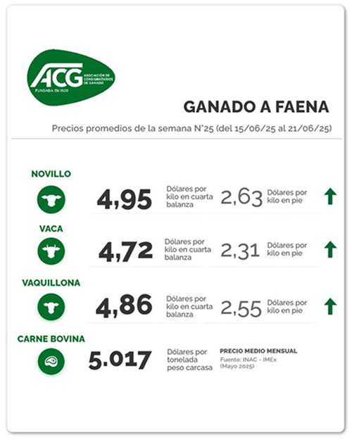 “Con la buena demanda y firmeza en el mercado”, los precios del gordo cerraron otra semana con valores al alza, según la reunión de precios de la ACG de este lunes. Los intermediarios fijaron una referencia promedio de US$ 4,95 por kg para los novillos (+6 cents), de US$ 4,72 por kg para las vacas gordas (+4 cents), y de US$ 4,86 (+8 cents) para las vaquillonas. El novillo especial de exportación quebró la barrera psicológica de los 5 dólares y cerró con una referencia media de US$ 5,01 por kg a la carne (+4 cents).