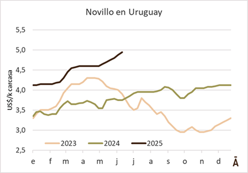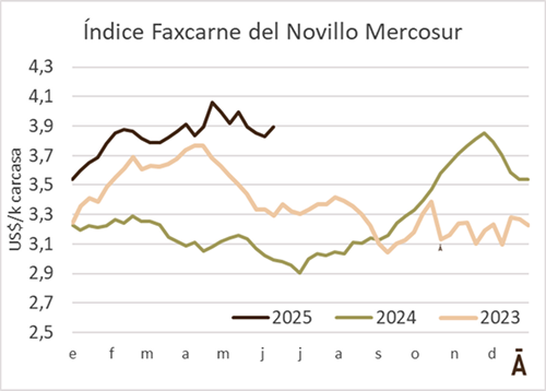 El Índice Faxcarne del Novillo Mercosur ganó 6 centavos en la última semana y llegó a US$ 3,89 por kg a la carne. El destaque semanal se lo llevó la plaza de Brasil, donde el promedio del macho para faena de los estados exportadores subió 15 centavos y quedó en US$ 3,55 por kg a la carne, retornando así a los niveles que tenía a principios de mayo. En la última semana los precios del boi gordo se fortalecieron en reales (+3%), al tiempo que también contribuyó una depreciación del dólar versus el real del 1,5% en la última semana.