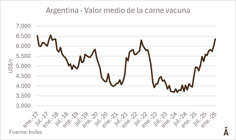 En el primer mes de 2026, la exportación de carne bovina, fresca y congelada de Argentina alcanzó las 52.413 toneladas (peso producto) por US$ 332,9 millones. Respecto del mes anterior, estas cifras marcan una caída de 8,2% en el volumen y de 2,2% en el valor.