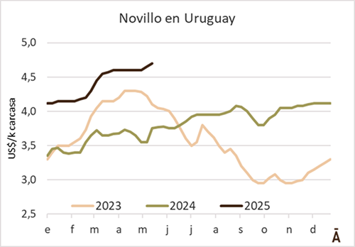 Con una demanda pujante por parte de la industria, aunque con cierta disparidad en los valores que propone la industria, los precios de la hacienda volvieron a tonificarse durante la última semana. Un intermediario dijo a WBR que se dan casos de industrias que ofrecen desde US$ 4,70 a US$ 4,80 por kg carcasa por un mismo tipo de novillo. Si bien llegan a cerrarse negocios puntuales por novillos especiales de la zona sur hasta US$ 4,85 por kg a la carne, “no son los negocios más corrientes”, comentó otra de las fuentes. En el caso de la vaca gorda, las carcas especiales arriba de los 260 kg de carne llegan hasta US$ 4,60 por kg, aunque la mayor parte de los negocios se hace sobre la franja de US$ 4,40-4,50. La vaquillona, en tanto, está un poco más calma que semanas anteriores por un menor dinamismo del abasto, con un precio que ronda los US$ 4,62 por kg a la carne.