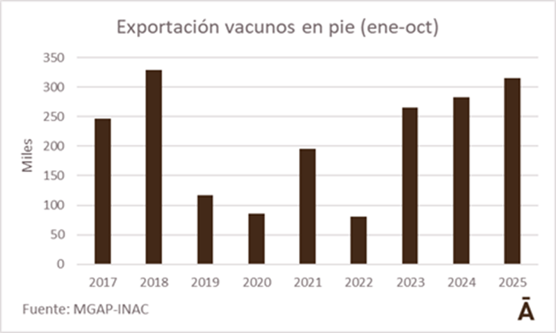 En los 10 primeros meses de 2025 Uruguay exportó 315.640 vacunos en pie, 11,4% más que en el mismo período del año pasado, informó el Instituto Nacional de Carnes (INAC). Es la mayor cantidad para ese período desde el récord de 2018.