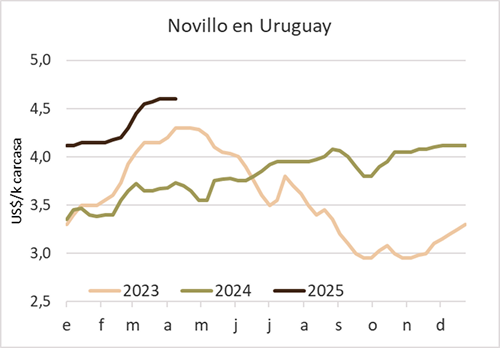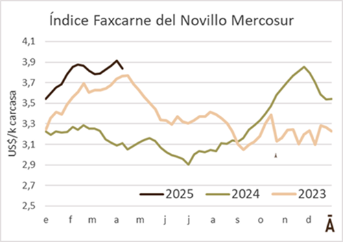 “Con buen nivel de faena y de operaciones, mercado equilibrado”, dijo la ACG en su reunión de precios de este lunes. Los intermediarios fijaron en su planilla una cotización promedio de US$ 4,55 por kg carcasa (+1 cent) para los novillos durante la semana cerrada al 5 de abril, pero dejaron sin cambios la cotización de la vaca gorda en US$ 4,27 por kg a la carne. La vaquillona, por su lado, ganó 2 cents y quedó en US$ 4,40 por kg carcasa.