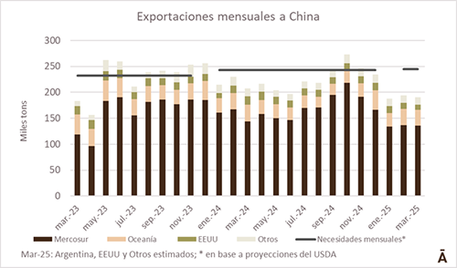 Las exportaciones de carne vacuna a China comenzaron 2025 en niveles significativamente inferiores a los del año pasado. Se estima que en el primer trimestre del corriente se embarcaron a China unas 575 mil toneladas de carne vacuna fresca, cerca de 80 mil toneladas menos que en el mismo período de 2024.