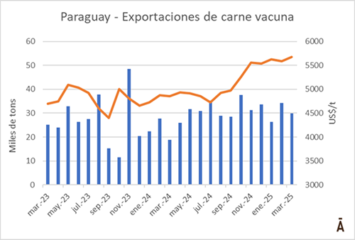 Las expectativas de disminución de la producción y de las exportaciones de carne vacuna previstas para este año en Paraguay no se confirmaron en el primer trimestre. De acuerdo con datos del Senacsa, Paraguay colocó en el mercado internacional 90.615 toneladas en el año a marzo, con un robusto crecimiento de 31% en la comparación con el mismo período de 2024. El valor medio de exportación creció 17% anual a US$/t 5.627.