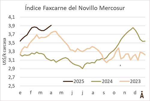 El valor medio del novillo en el Mercosur subió por cuarta semana consecutiva. El Índice Faxcarne aumentó 4 cents a US$ 3,91 el kilo carcasa, acumulando una recuperación de 13 cents en cuatro semanas.