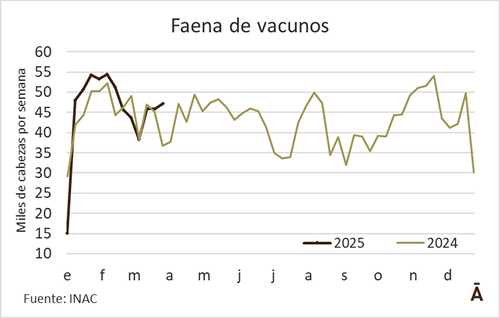 La faena de vacunos creció en más de mil cabezas y fue la mayor en seis semanas. INAC informó que en la semana al 29 de marzo ingresaron a planta 47.150 vacunos, 1.267 más que en anterior y significativamente por encima de la misma semana del año pasado, que había sido la de Pascuas.