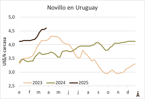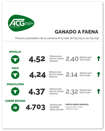 Lejos de estabilizare, los precios de la hacienda mostraron otra marcada suba durante la última semana al 22 de marzo. Según informó la ACG tras su reunión de precios de este lunes, los negocios por los novillos gordos se cerraron en promedio a US$ 4,52 por kg carcasa (+9 cents), la vaca gorda a US$ 4,24 (+5 cents), y la vaquillona a US$ 4,37 (+8 cents), con una “continuidad de la buena demanda”.