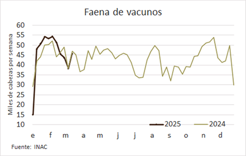 La faena de vacunos sufrió escasas variantes. En la semana al 22 de marzo, de acuerdo con información de INAC, se faenaron 45.883 vacunos, casi sin cambios respecto a la anterior y menos de 2% superior a la misma semana del año pasado.