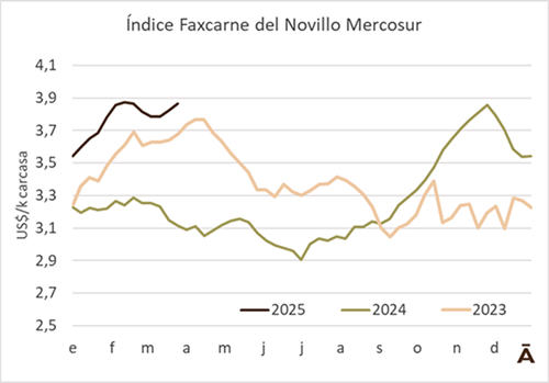 Los precios de la hacienda a faena aumentaron por tercera semana consecutiva. El Índice Faxcarne del Novillo Mercosur subió 4 cents a US$ 3,87 el kilo carcasa, acumulando una recuperación de 9 cents en las tres últimas semanas.