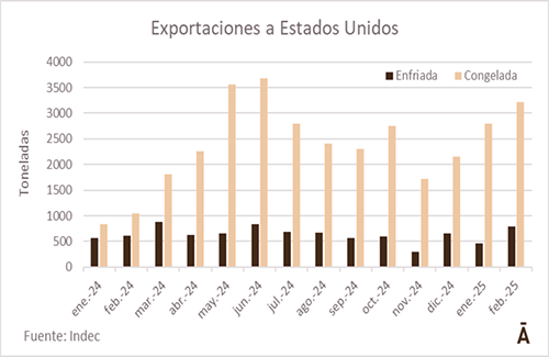 Las exportaciones argentinas de carnes bovinas alcanzaron en febrero 50.080 toneladas (peso producto), de acuerdo con el INDEC, volumen que resulta 7,2% superior al del mes previo, pero 27,5% inferior al de febrero de 2024. En valor, los US$ 243,6 millones facturados estuvieron 5,6% por encima del mes previo, pero cayeron 4,5% en la comparación interanual.