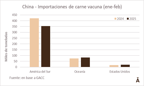 La mayoría de los orígenes de la carne vacuna importada redujeron sus colocaciones en el mercado de China en los dos primeros meses de 2025 comparado con el mismo período del anterior. Esto llevó a una caída en la comparación anual de 11% a 468 mil toneladas. Sin embargo, hubo dos que fueron contra la corriente: Australia y Estados Unidos.
